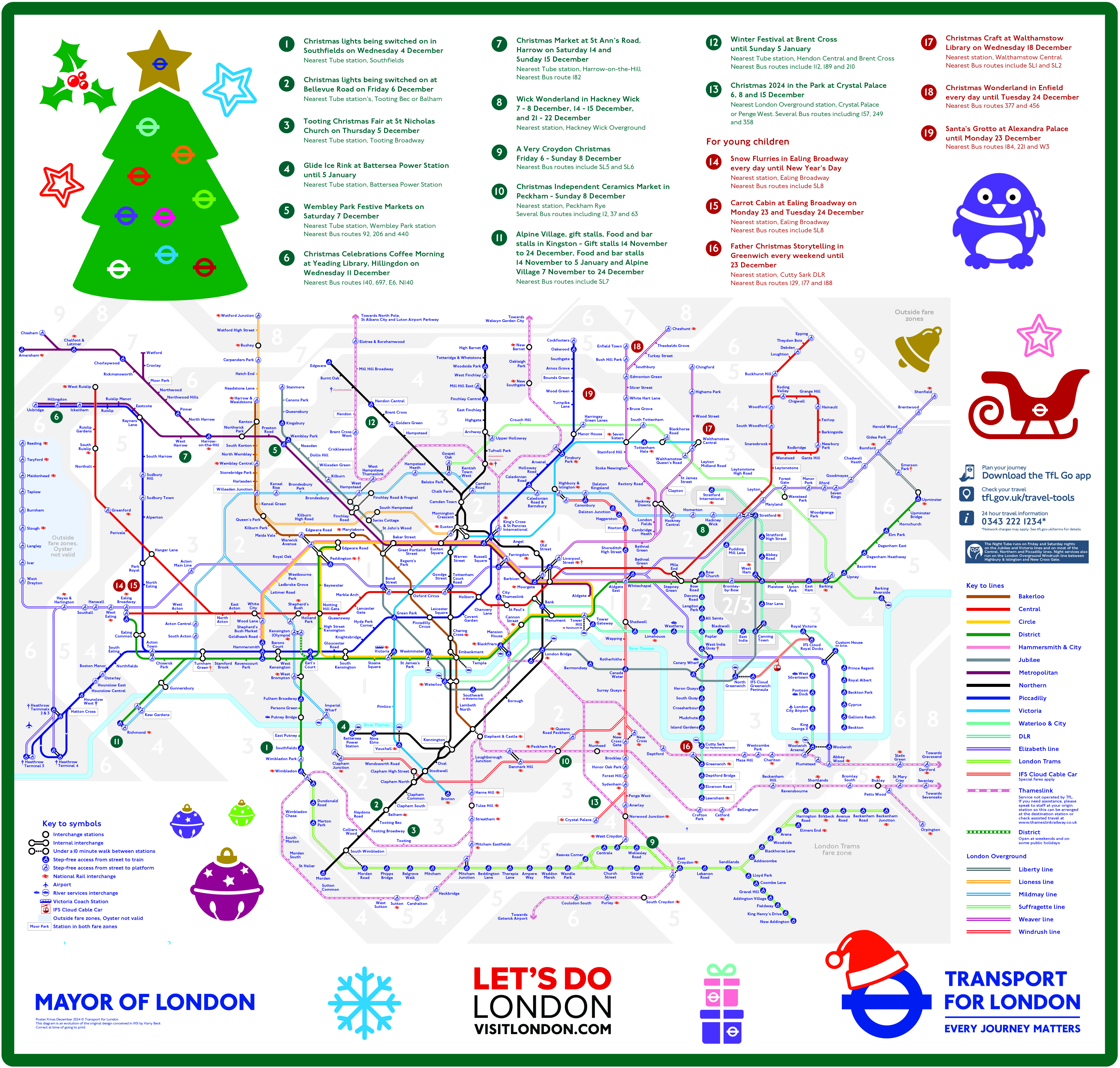 The new Christmas Tube map highlights 19 festive attractions in Zone 2 and beyond and covers boroughs from Croydon to Ealing to Wandsworth and Waltham Forest, with numbers corresponding to the nearest station. From festive light displays to Christmas markets, the map encourages Londoners and visitors to explore more of the capital this winter.