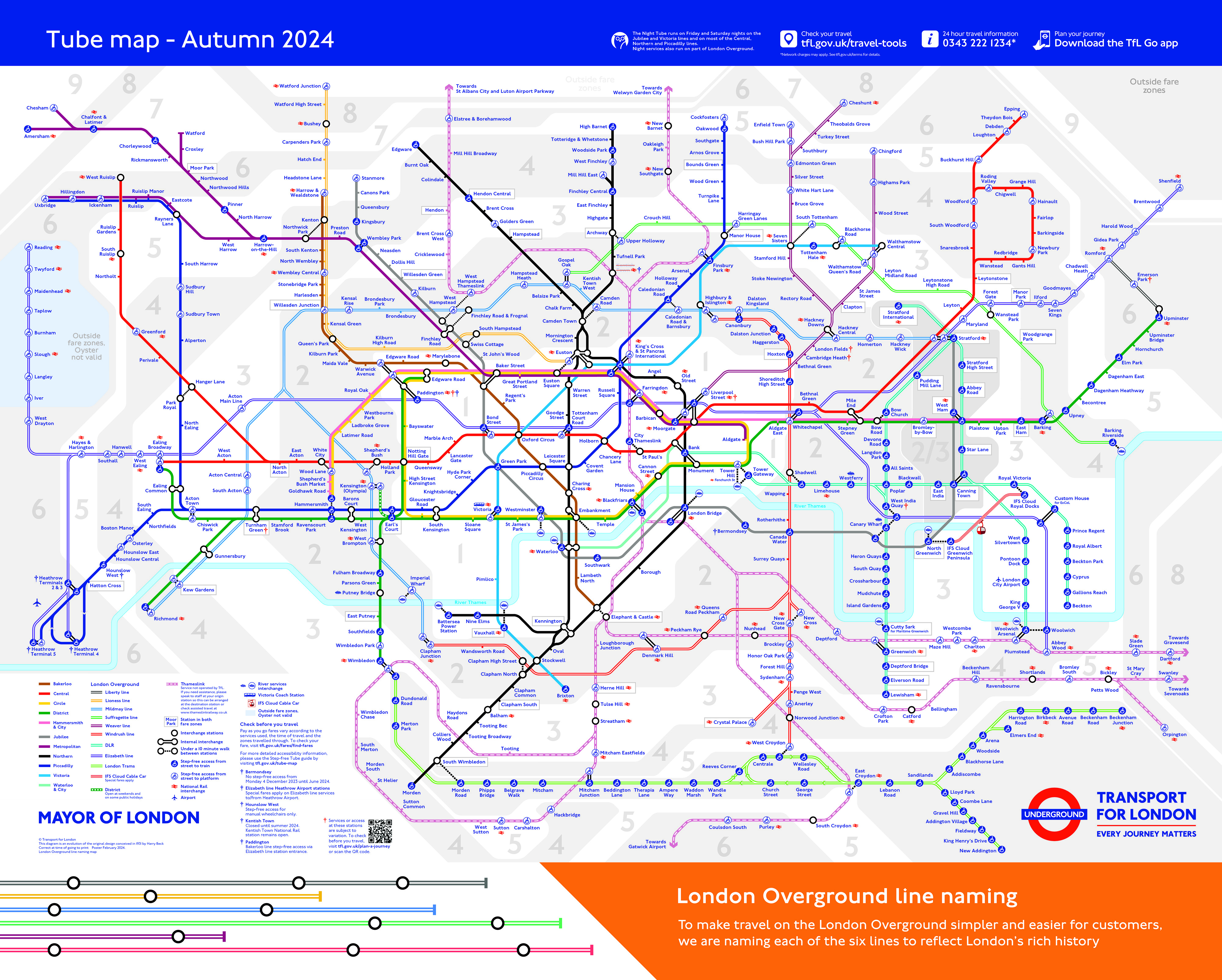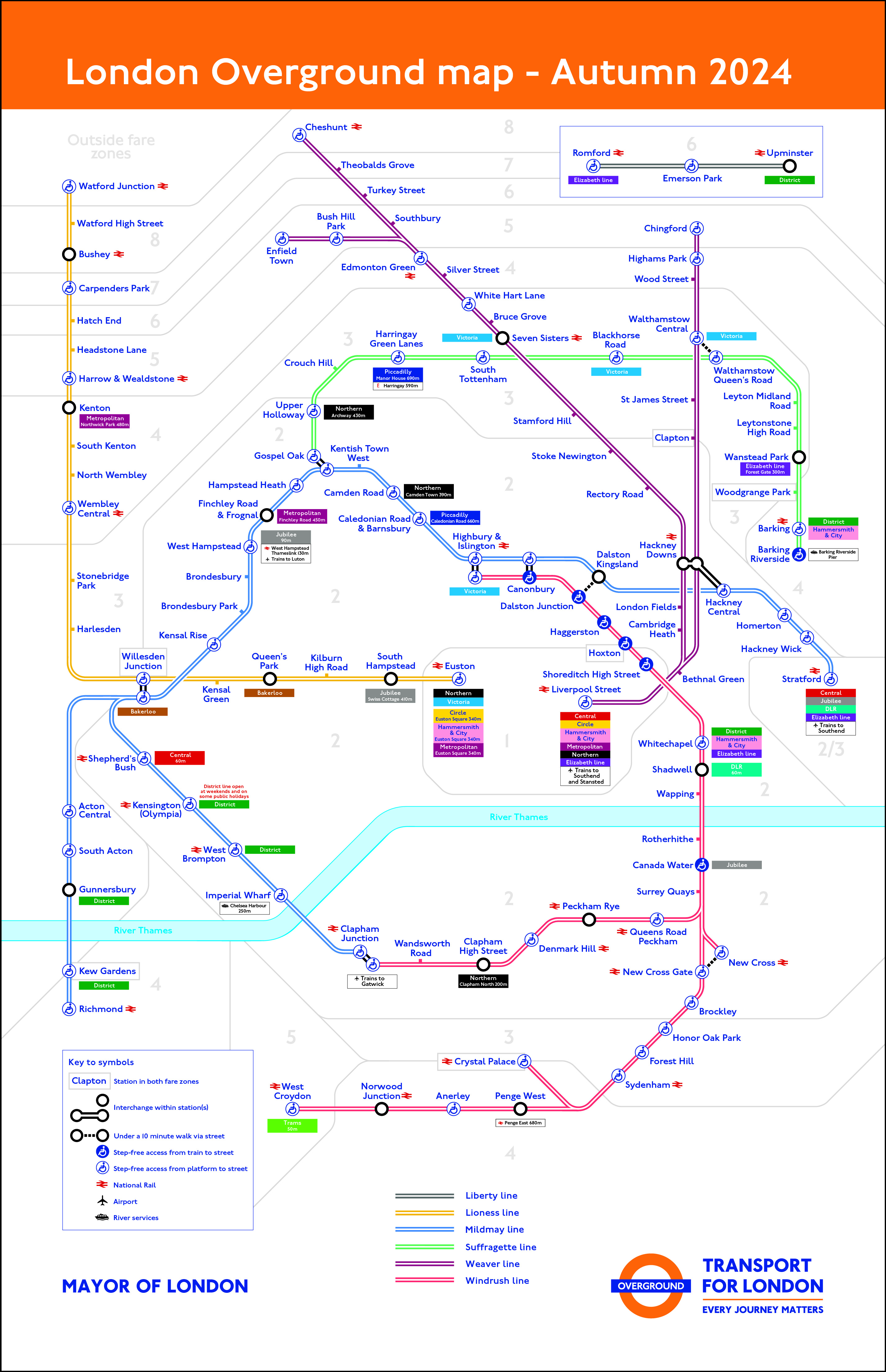 Each route will be represented by a new line name and colour on the Tube map, on train line diagrams, at stations and on digital journey planning tools, such as TfL Go. The much-loved orange roundel will continue to be used across the London Overground network.