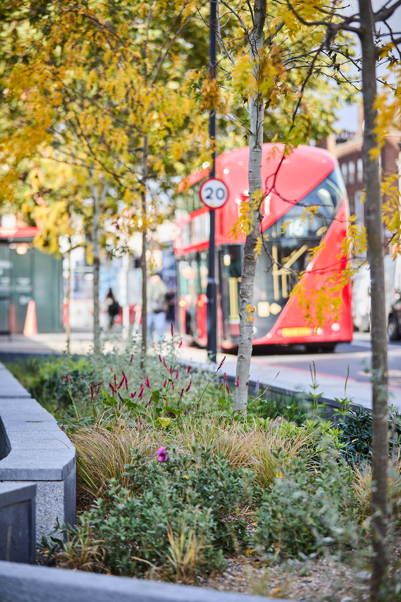 On the surface, the planted gardens can be seen on three corners of the road within the Marylebone Flyover underpass and are around 300 square metres when combined, which would fit 10 New Routemaster buses. The gardens have been planted with 11 trees, 95 shrubs, more than 1,100 perennial plants and almost 2,300 bulbs in total. Londoners can spot flowering species like pink geraniums, orange-coloured Kniphofia and blue wood-aster in full bloom, adding colour, life and nature to these urban streets. The plant species have been curated to support pollinating insects when in season and can thrive in local climate and soil conditions as they require minimal maintenance, tolerating both extreme wet and dry conditions.