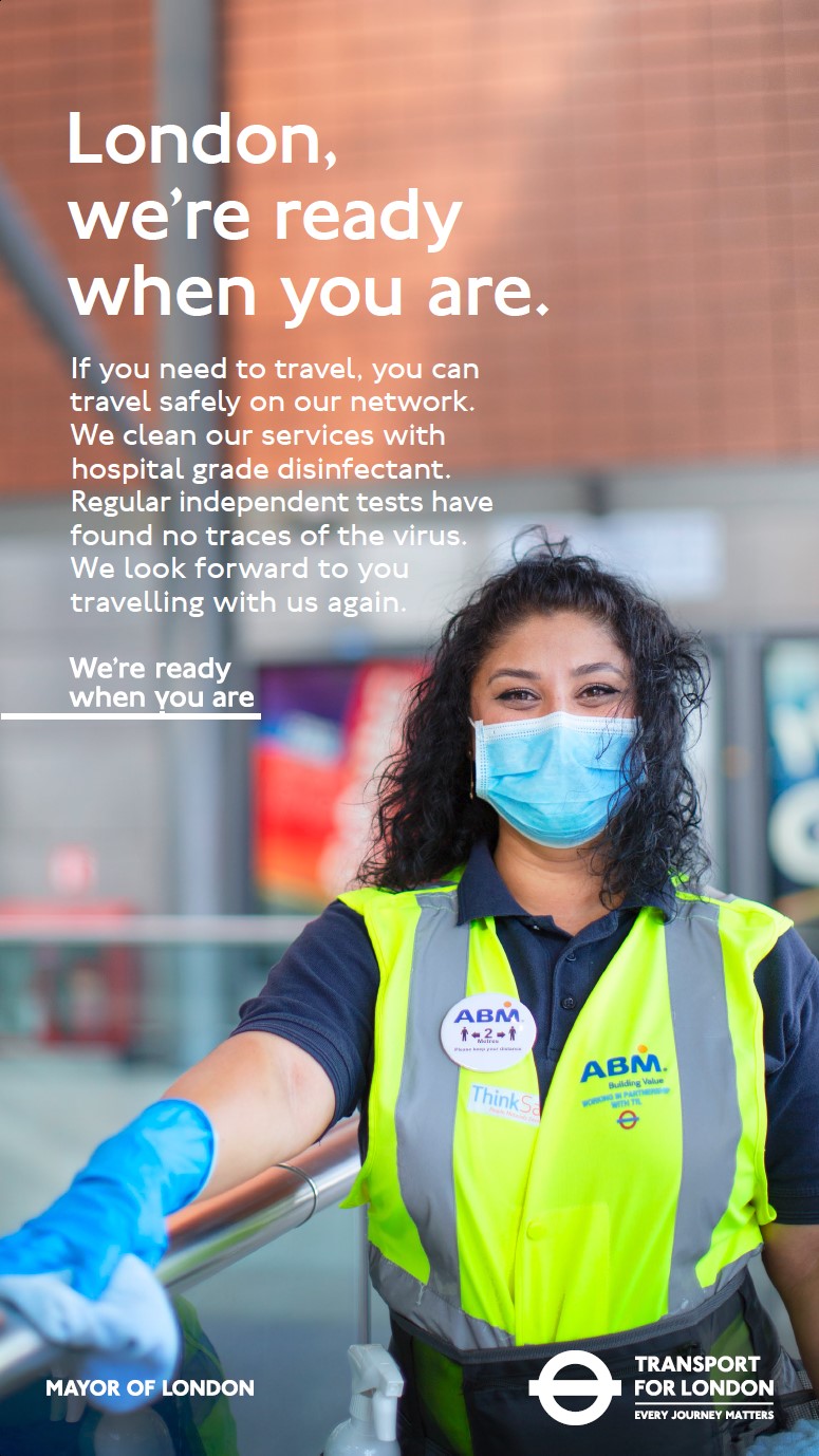 TfL’s enhanced cleaning regime continues to make the network cleaner than ever. Trains, trams, buses and stations are cleaned with hospital-grade cleaning substances that kill viruses and bacteria on contact and provide ongoing protection.