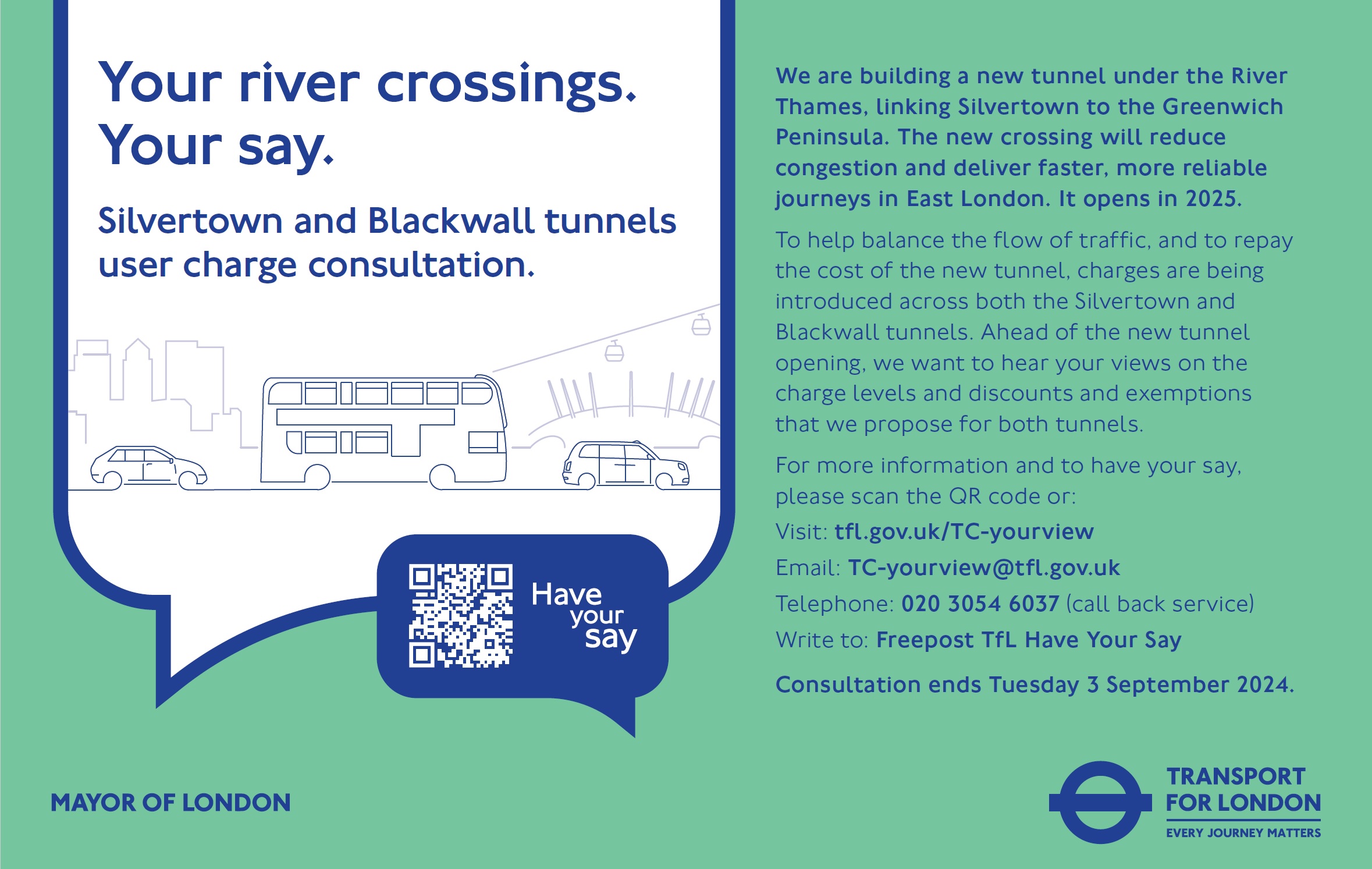 During the eight-week consultation, Londoners will be able to comment on the proposed tunnel user charges, discounts and exemptions. This will enable TfL to ensure the user charge and range of discounts, both of which will be subject to the approval of the TfL Board, have been informed by feedback from the public.